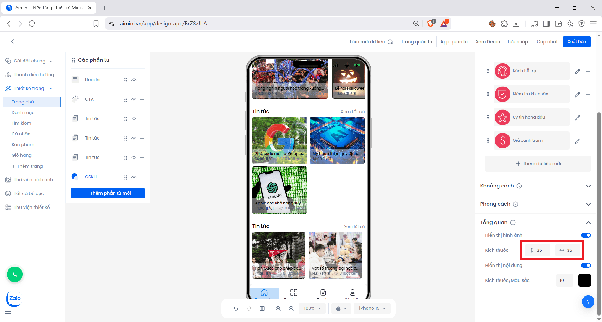 Người dùng có thể chọn hoặc tăng/giảm chung kích thước của hình ảnh theo chiều rộng và chiều dài tại