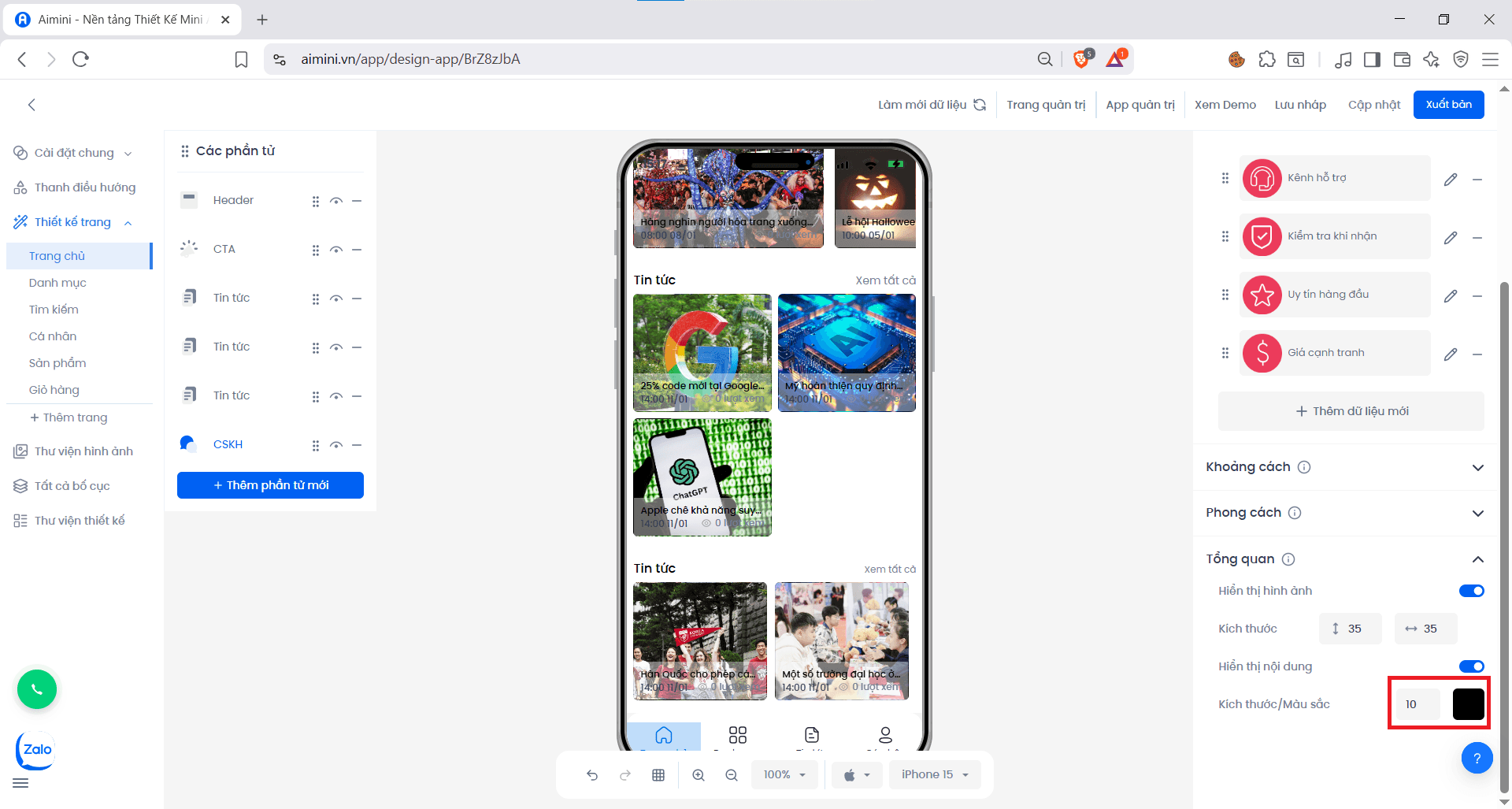 Người dùng có thể điều chỉnh kích thước và màu sắc cho nội dung hỗ trợ tại
