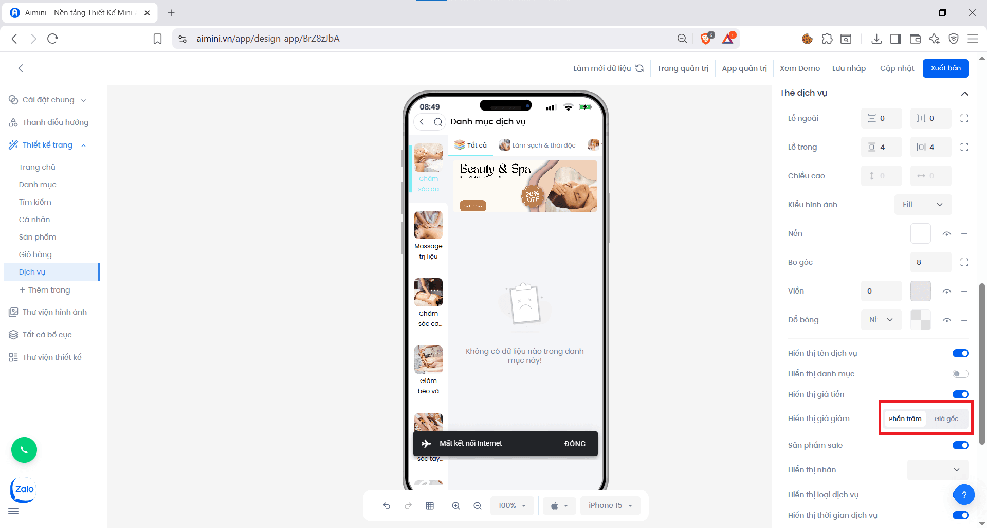 Bố cụcNgười dùng có thể lựa chọn các bố cục hiển thị dịch vụ, bao gồm: Bố cục dọc, Bố cục ngang, Trượt ngang, Tab danh mục, Danh sách dịch vụ, Nhóm danh mục.