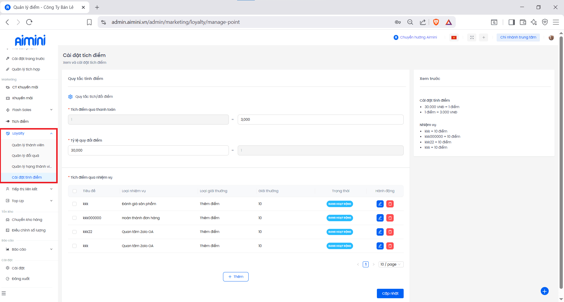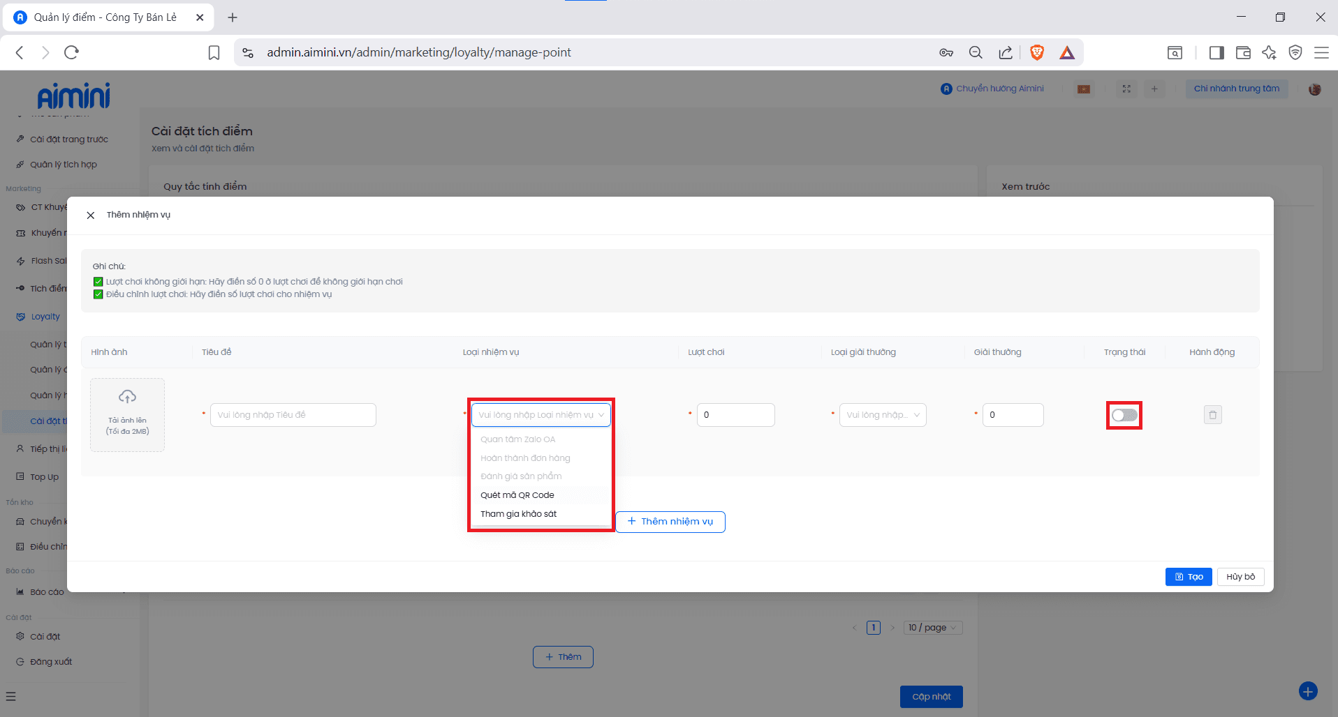 - Cài đặt nhiệm vụ để tích điểm: Chọn nút “+ Thêm” ở phần “Tích điểm qua nhiệm vụ” để cài đặt nhiệm vụ tích điểm cho người dùng → Điền các thông tin mà biểu mẫu yêu cầu → Chọn “Tạo” để thêm nhiệm vụ tích điểm. Có các loại nhiệm vụ tích điểm như sau:
