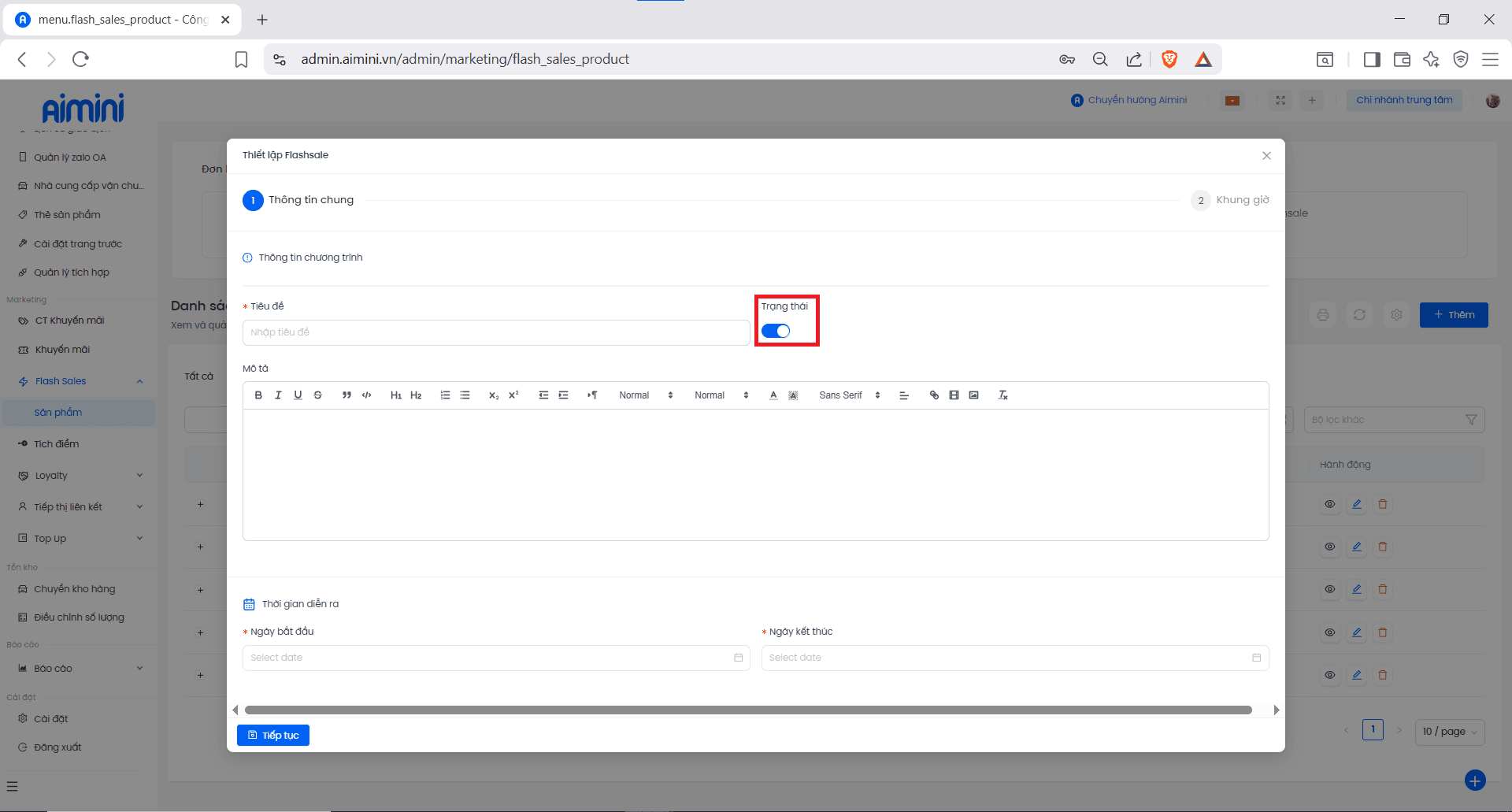 Tạo các chương trình flash sale cho các sản phẩm của hệ thống. Chọn “+ Thêm” → Điền các thông tin biểu mẫu yêu cầu → Chọn “Tạo” để thêm chương trình flash sale