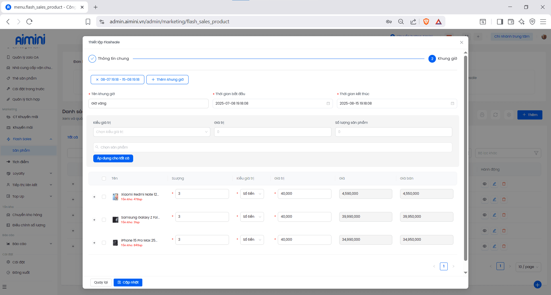 Người dùng có thể điền các thông tin flash sale cho toàn bộ sản phẩm được áp dụng chương trình hoặc điều chỉnh từng sản phẩm theo điều kiện khác nhau