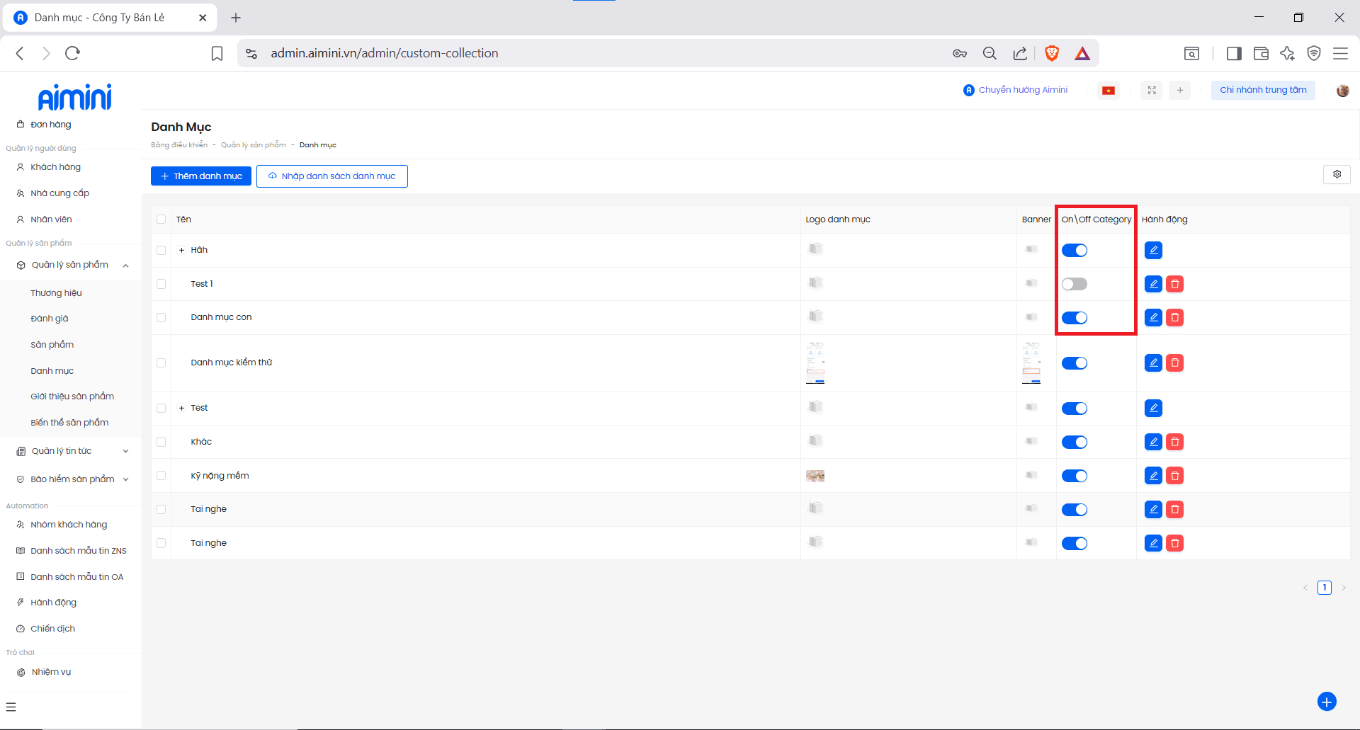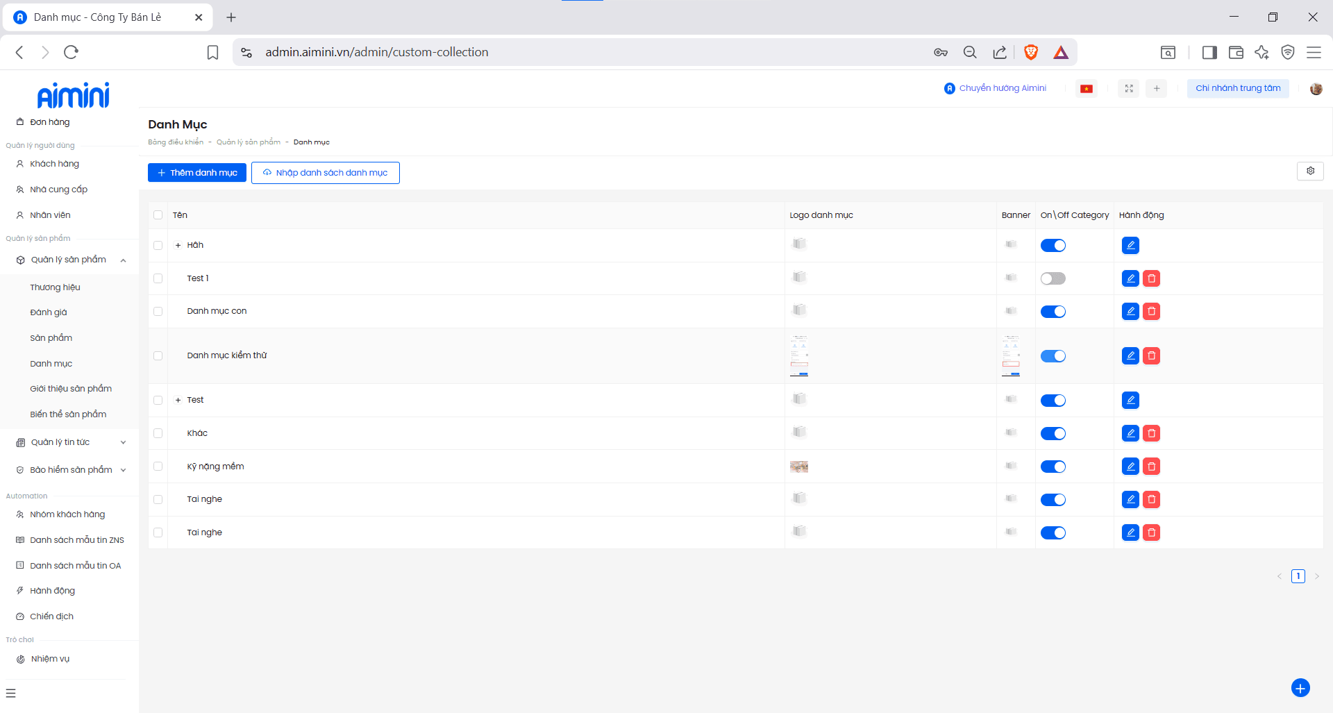 Ở giao diện tổng quan, người dùng có thể tạo các Danh mục cho các sản phẩm của hệ thống