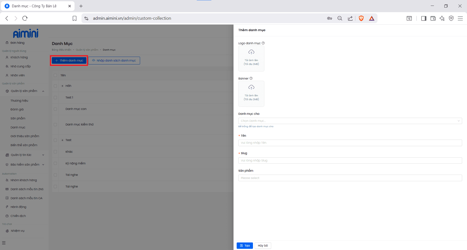 Chọn “+ Thêm danh mục” để tạo danh mục cho các sản phẩm