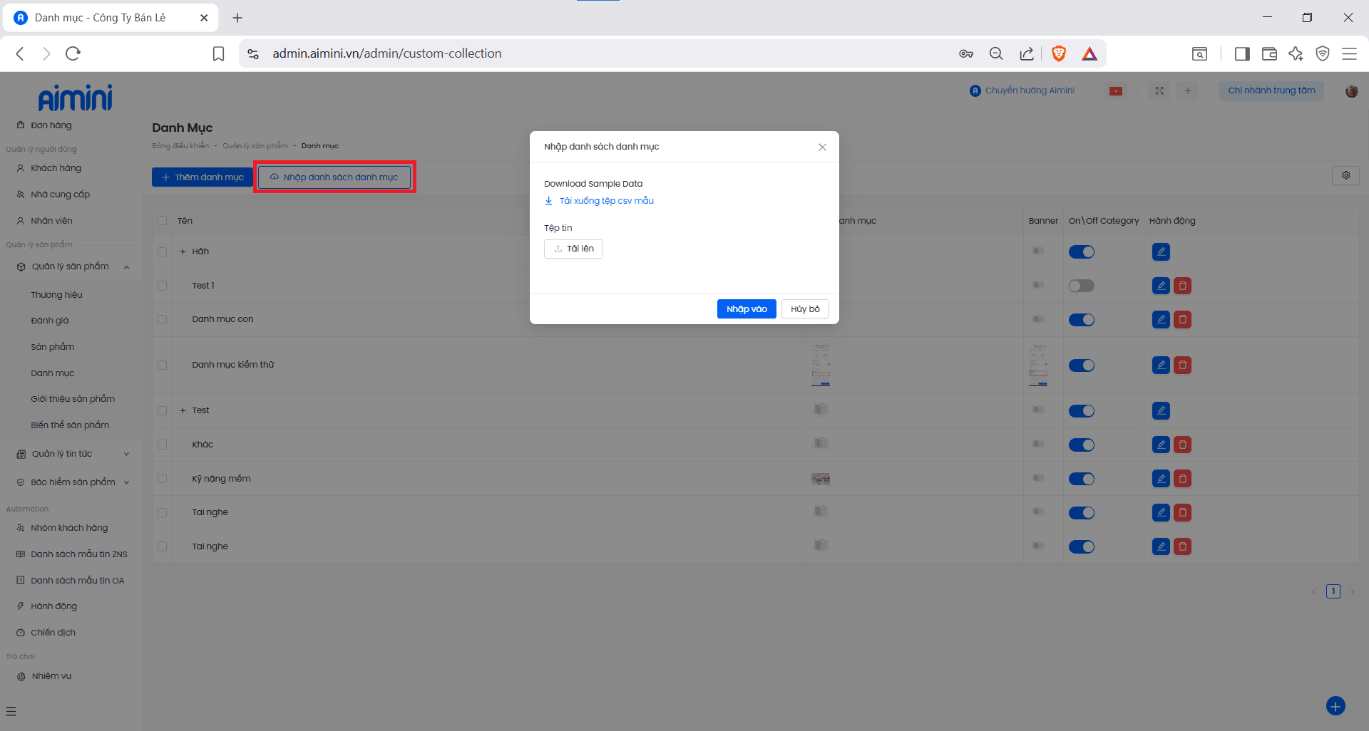 Hướng dẫn quản lý danh mục sản phẩm: thêm, sửa, xóa, nhập file và tạo danh mục con.