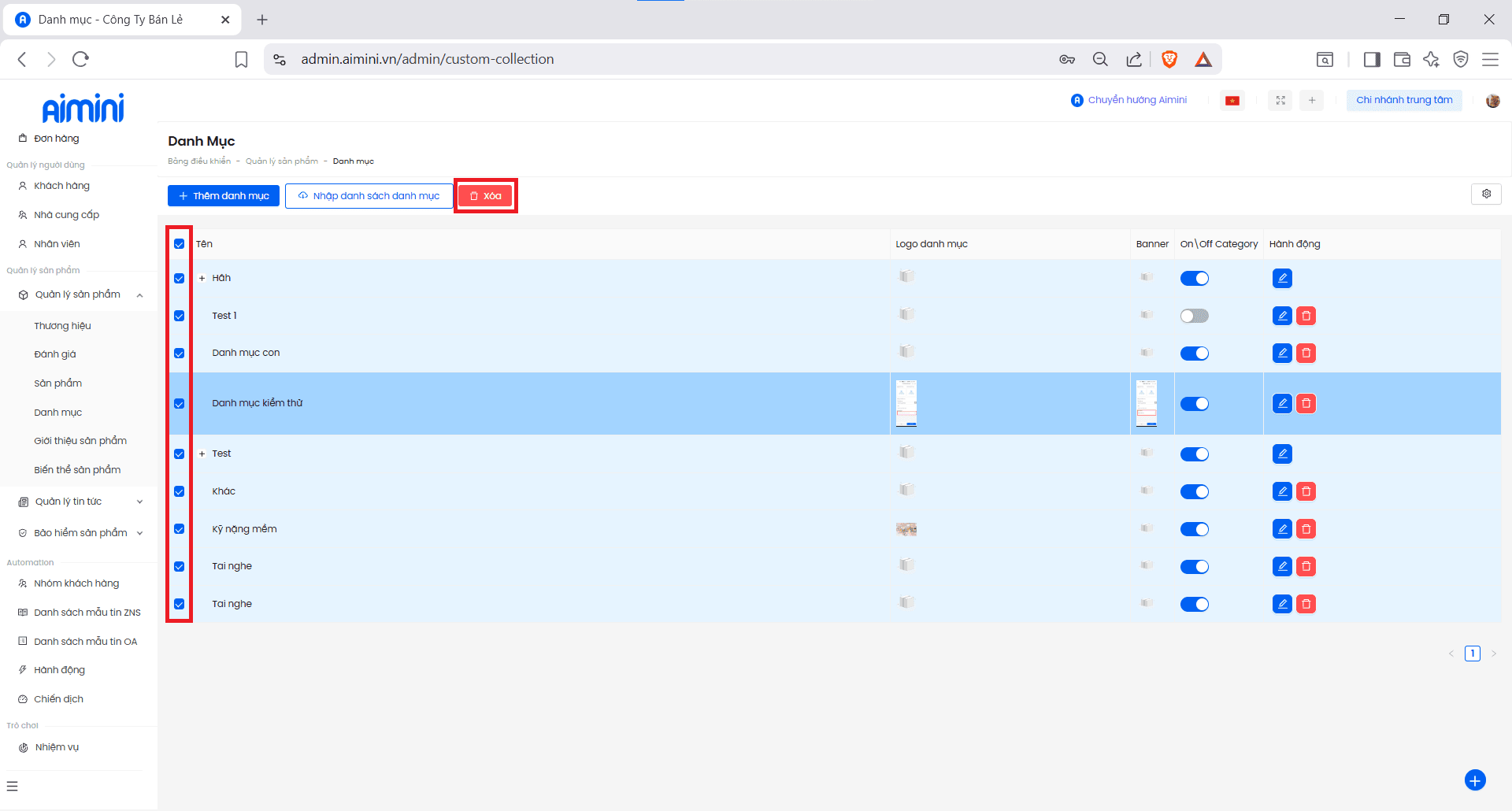 Chọn icon check-box để có thể xóa một hoặc nhiều Danh mục
