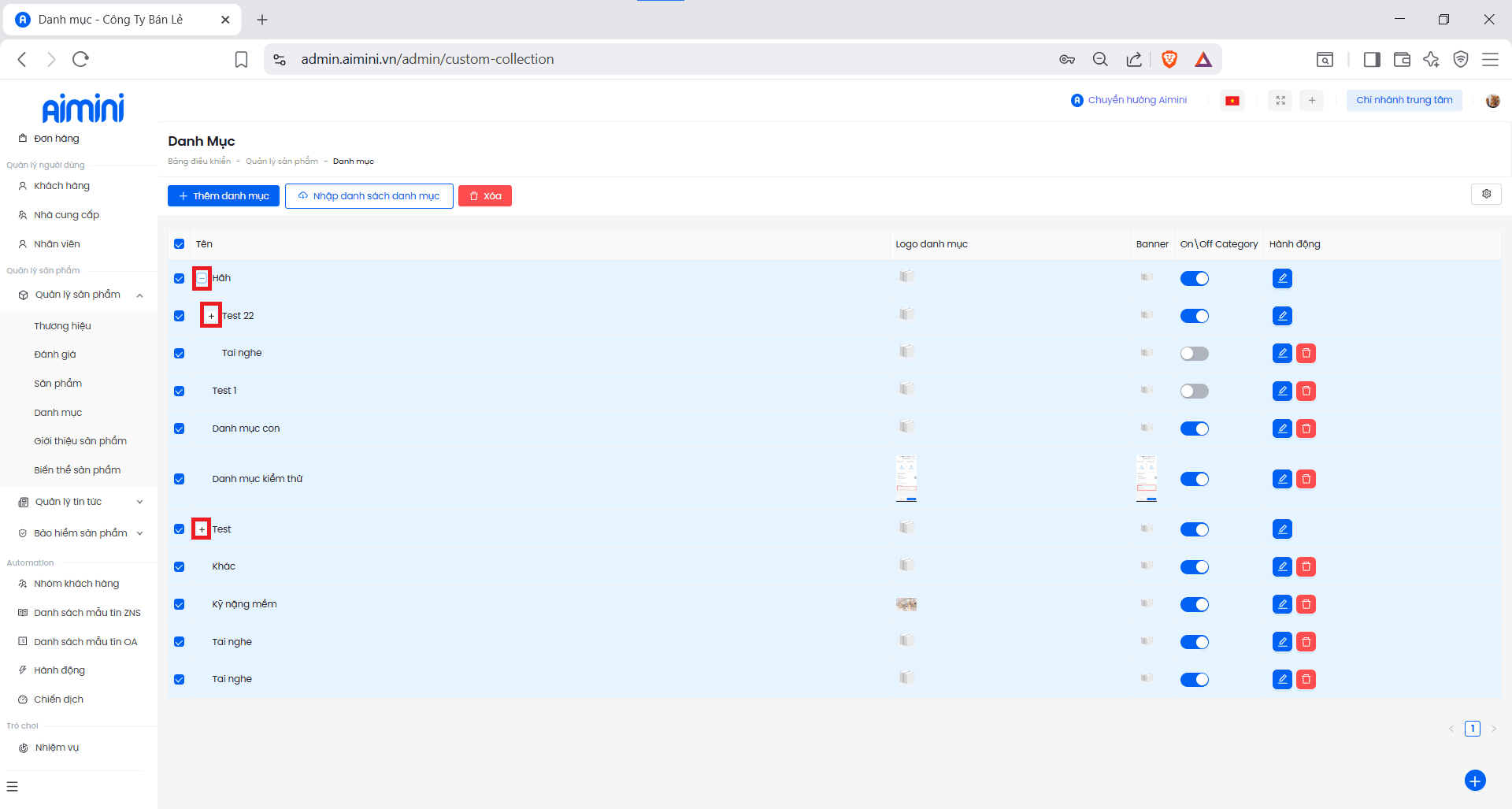 Người dùng có thể tạo các danh mục con bằng cách xét danh mục cha khi khởi tạo danh mục. Để hiển thi danh mục con, nhấn ”+” ở trước các danh mục