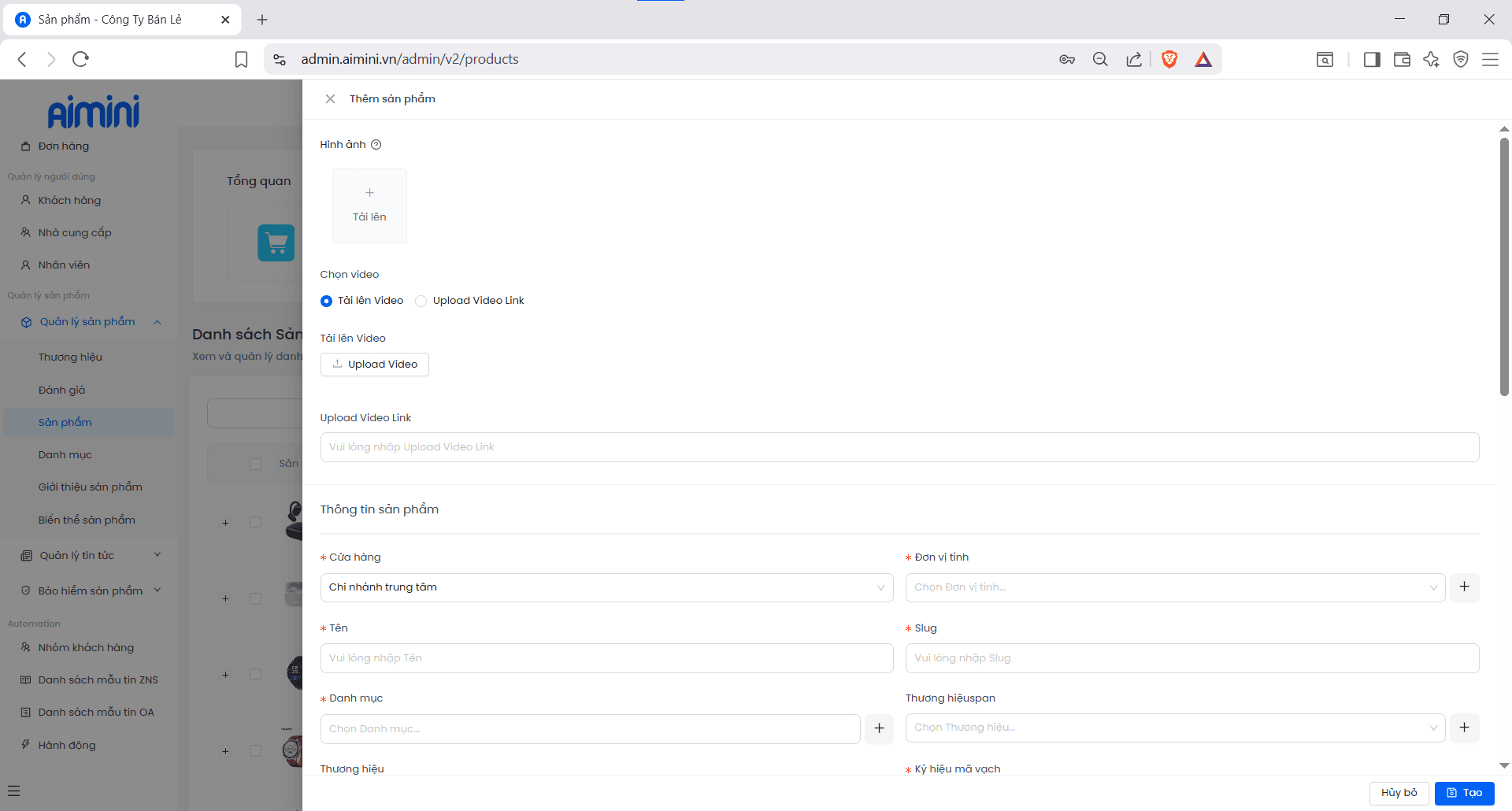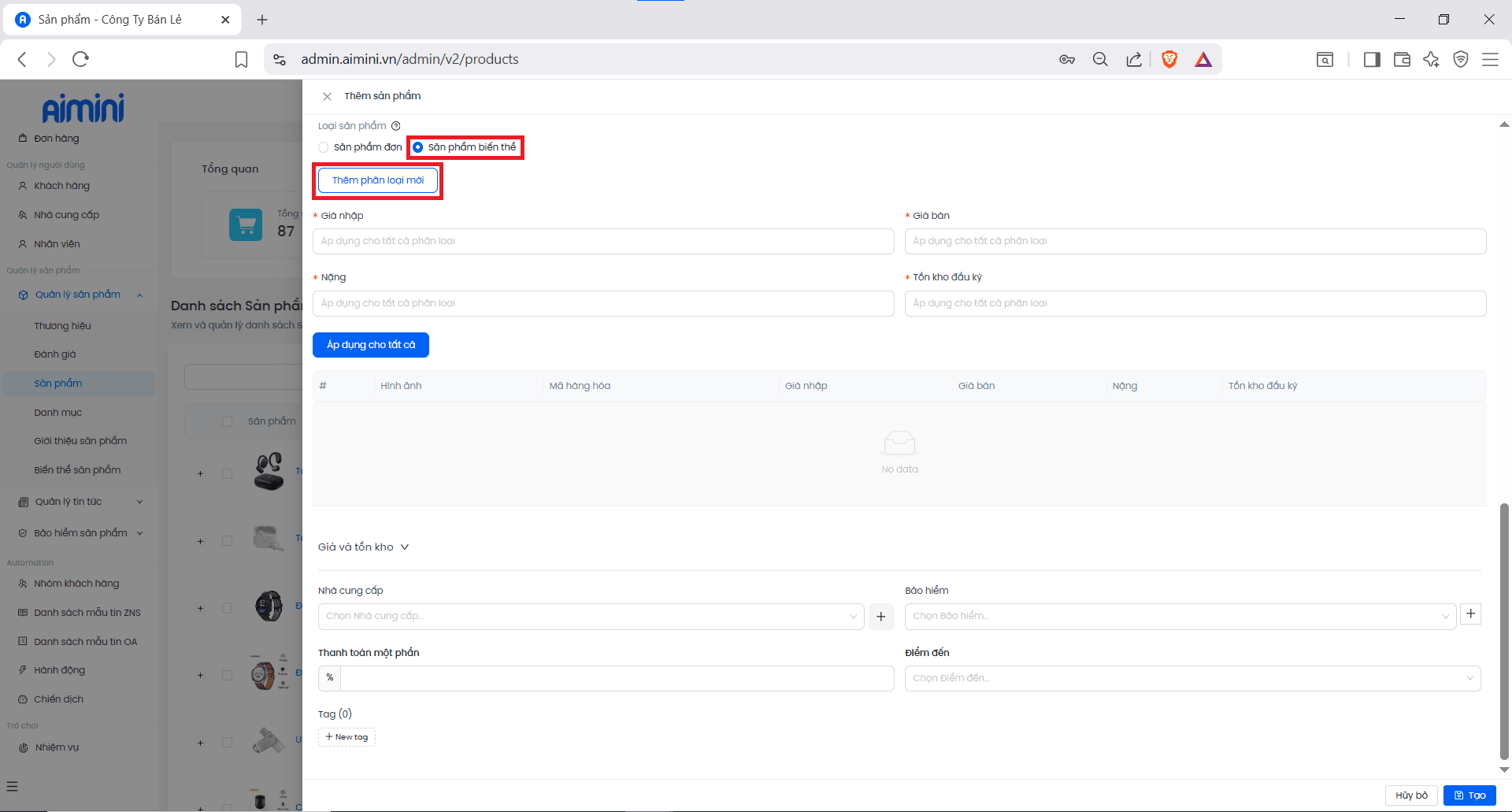 Chọn “+ Thêm sản phẩm” để thêm sản phẩm mới cho hệ thống