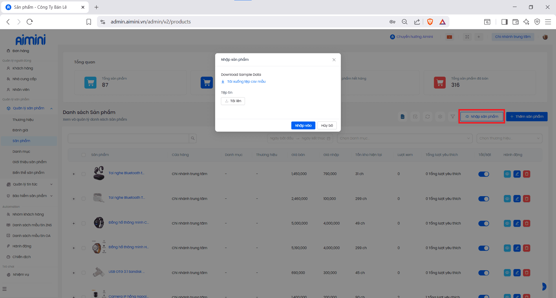 Thêm nhiều sản phẩm bằng cách import file excel ➝ Tải về template mẫu ➝ Nhập thông tin các sản phẩm ➝ Upload file ➝ Chọn “Nhập vào” để thêm các sản phẩm