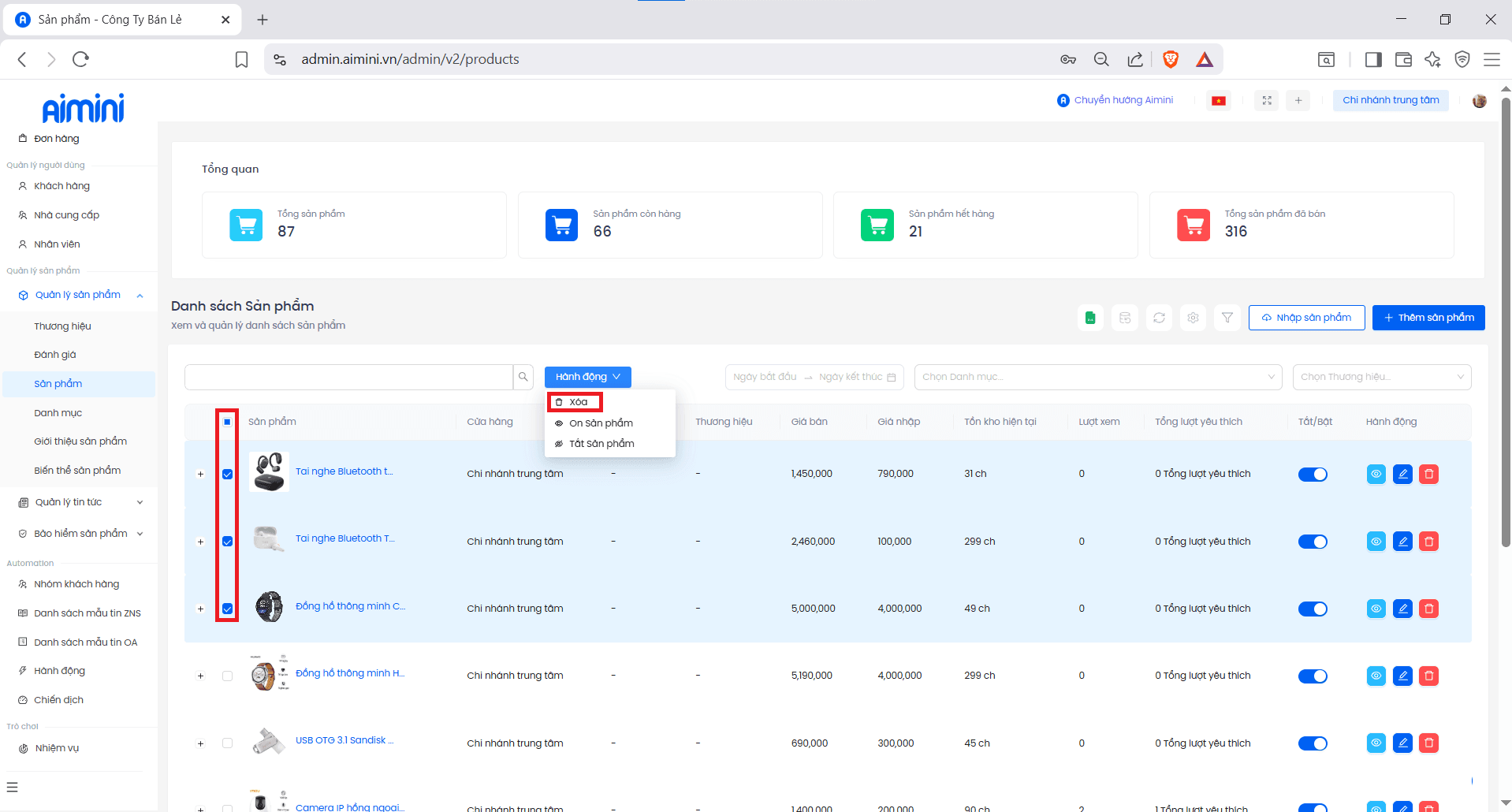 Xóa nhiều sản phẩm cùng lúc. Chọn check-box ➝ Hành động ➝ Xóa