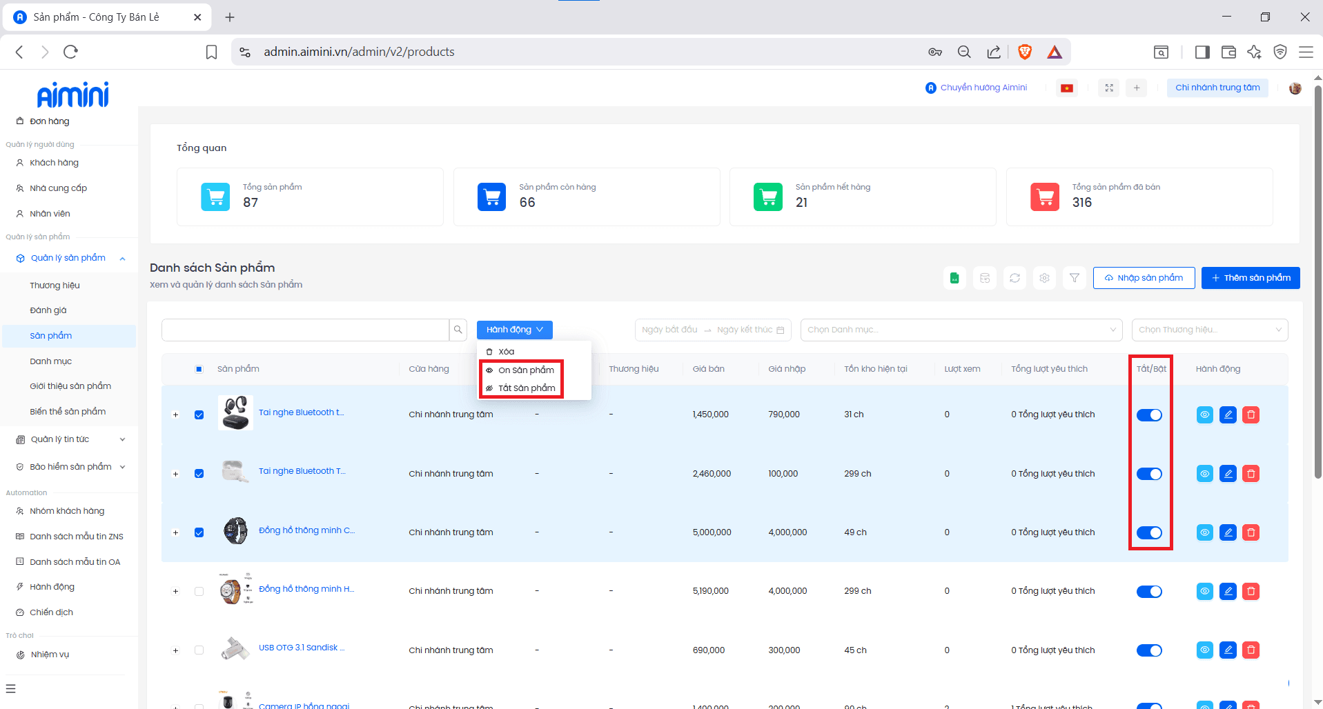Bật/tắt nhiều sản phẩm cùng lúc. Chọn check-box ➝ Hành động ➝ On/Off sản phẩm