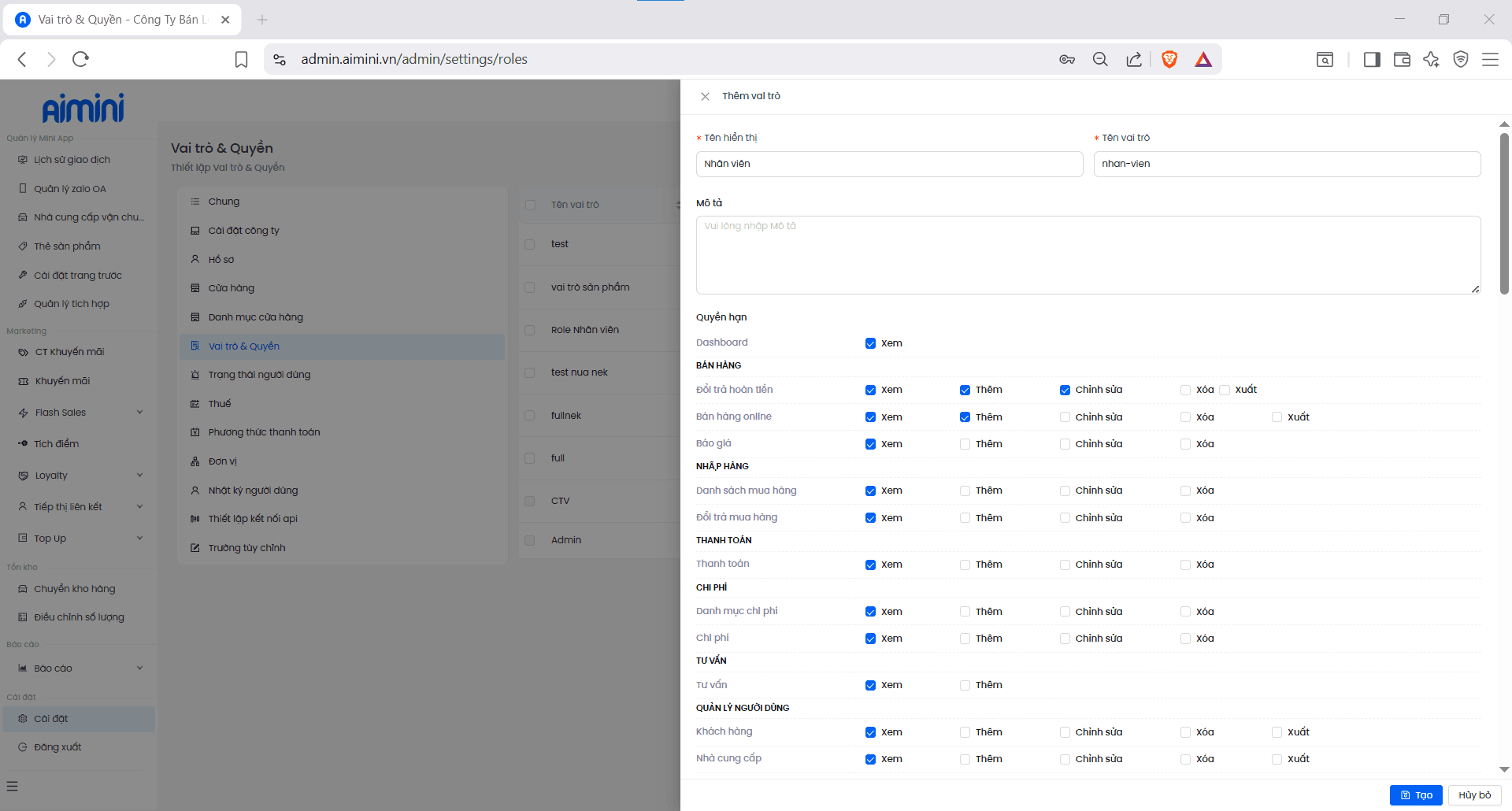 Thêm vai trò bằng cách: Chọn nút “+ Thêm vai trò” → Biểu mẫu sẽ được hiển thị → Điền và chọn các thông tin phù hợp → Chọn “Tạo” để hoàn tất thao tác. (Lưu ý: Tên vai trò không được trùng lặp)