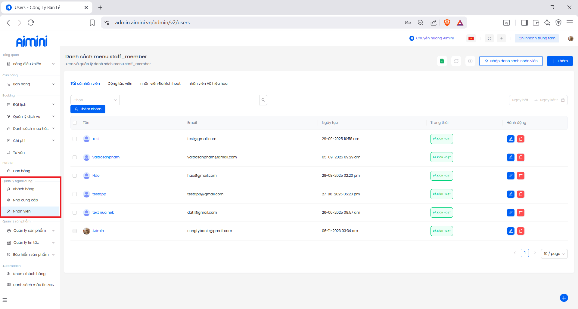 Các thông tin của nhân viên (tên, email, ngày tạo, trạng thái)
