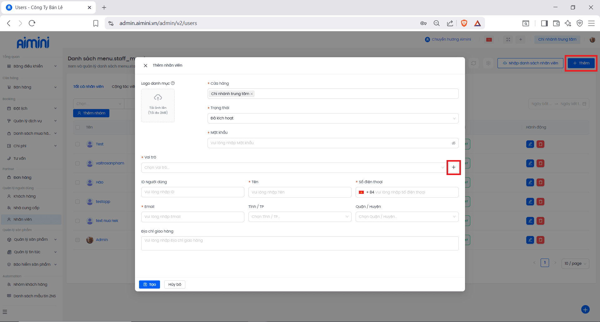 Thêm nhân viên: Chọn “+ Thêm” để thêm nhân viên mới → Điền các thông tin biểu mẫu yêu cầu và chọn vai trò cho nhân viên (Nếu chưa tạo vai trò thì nhấn nút để tạo vai trò và phân quyền hạn cho nhân viên) → Nhấn “Tạo” để hoàn tất quá trình tạo nhân viên mới
